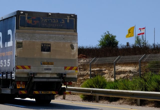 La route frontalière. À l'arrière-plan, des drapeaux du Liban et du Hezbollah. Photo Alex Levac