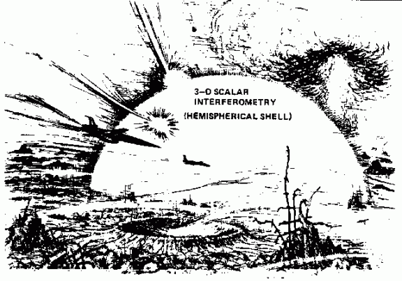 Les ondes scalaires peuvent être transformées en dôme autour d'objets, tels que des villes ou des maisons (maisons d'édition incluses). Un tel champ de force d'onde scalaire est généralement connu sous le nom de bouclier de Tesla et il serait analogue aux «boucliers» mentionnés dans la série populaire «Star Trek». Les boucliers Tesla ont une application défensive définie et ne peuvent en aucun cas être utilisés à des fins offensives (bien qu'un peloton de soldats chargeant dans un bouclier Tesla soit instantanément désintégré). La seule défense contre l'explosion d'un obusasseur d'ondes scalaire serait un bouclier de Tesla.