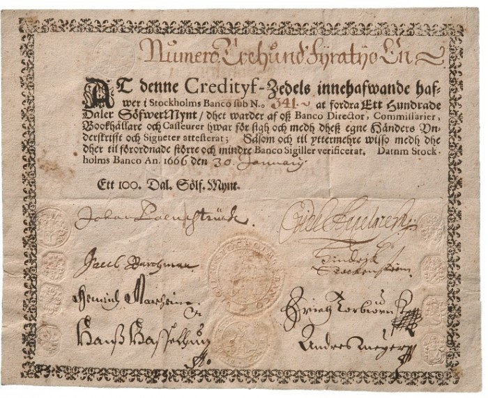 C'est Johan Palmstruch, fondateur de Stockholms Banco, la première banque suédoise, qui a émis les billets. La raison en était qu'en 1660, le gouvernement central avait commencé à frapper de nouvelles pièces d'un poids inférieur à celui des pièces plus anciennes. Cela a entraîné que de nombreux déposants voulaient récupérer leurs vieilles pièces plus lourdes, car elles avaient une valeur métallique plus élevée. Cela a mené à une ruée vers les banques. Pour contrer ce phénomène, Palmstruch a commencé à émettre des certificats de dépôt. Il s'agissait d'un titre qui donnait au propriétaire le droit de retirer le montant déposé en pièces de monnaie.