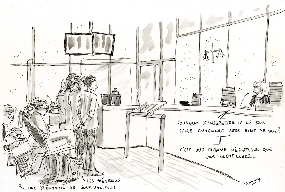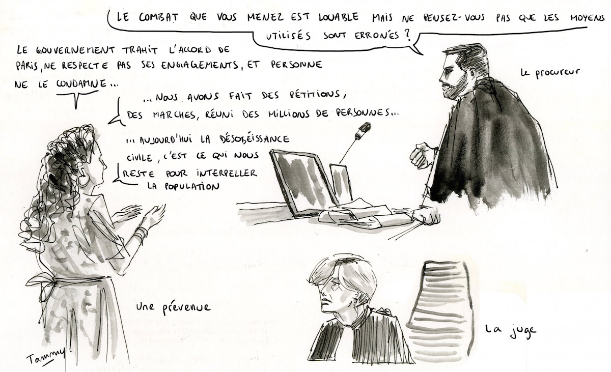 Sous le feu des questions de la présidente du tribunal, Anne Wyon, et du procureur, les militants défendent leur mode d'action. « Était-il nécessaire de commettre une infraction pour défendre votre cause ? » demande la magistrate à Pauline Boyer. « Je pense que oui, répond la coordinatrice d'Alternatiba. Le dérèglement climatique s'accélère et va être irréversible. Chaque minute compte. Symboliquement, décrocher le portrait d'Emmanuel Macron, c'était laisser un mur aussi vide que sa politique. » Le procureur : « Votre combat est louable madame, mais ne pensez-vous pas que les moyens pour y parvenir sont erronés ? » « De nombreux droits ont été arrachés grâce à des luttes non violentes, répond la militante écologiste. Elles permettent de faire évoluer la société. »