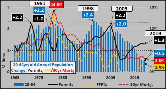 Alors, qu'est-ce que cela signifie pour le logement ? Sur une base nette, presque tous les logements sont achetés par le segment de la population âgée de 20 à 64 ans... Ainsi, le graphique ci-dessous montre leur variation annuelle (colonnes bleues), les permis de construire (colonnes noires), le taux des fonds fédéraux (ligne jaune en pointillés) et le taux des hypothèques sur 30 ans (ligne rouge en tirets). La population âgée de 20 à 64 ans a connu deux pics de croissance annuelle en 1981 et 1998, soit plus de 2,2 et 2,4 millions de personnes de plus pendant ces deux années. Quant aux permis de construire, ils ont vacillé de 1 à 2,2 millions par an de 1965 à 2005. Mais le noyau de la population et les permis de construire se sont essentiellement reflétés de façon aléatoire entre 1965 et 2005. Cependant, depuis 2005, le nombre de permis a chuté comme jamais depuis 1950, alors que la croissance des acheteurs potentiels est tombée à des niveaux jamais vus depuis avant 1950. Bien sûr, l'adoption du ZIRP par la Fed et les bas taux hypothécaires à 30 ans ont stimulé les constructeurs de maisons... en conjonction avec les investisseurs à la recherche d'un véhicule de flux de trésorerie et les étrangers à la recherche d'un endroit sûr pour garer les liquidités excédentaires. Cependant, aujourd'hui, ces trois sources d'achat ont leurs propres problèmes... la croissance de la population parmi les acheteurs est en baisse, les étrangers ont été effrayés par les mesures monétaires et administratives, et les investisseurs font face à des plafonds de loyer par propriété.