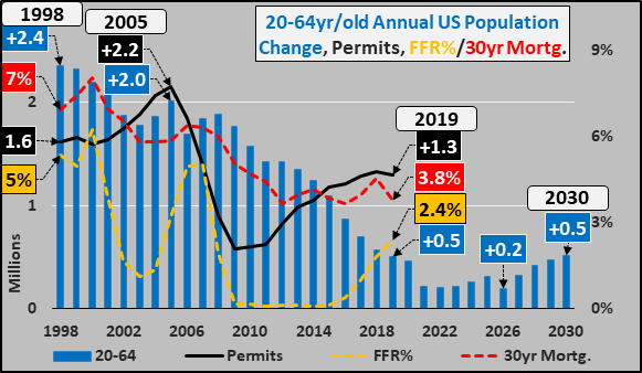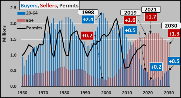Comme le montrent les colonnes bleues du graphique ci-dessus de 2019 à 2030, la croissance annuelle des acheteurs sera à un niveau jamais vu depuis avant la Seconde Guerre mondiale. D'ici 2021, on prévoit que la croissance de la population âgée de 20 à 64 ans n'atteindra que 200 000 personnes par année (et qui dépend entièrement de l'immigration, faute de quoi le déclin sera déterminant). Sur une base mensuelle, cela signifie moins 20 000 nouveaux employés potentiels, moins 20 000 acheteurs potentiels de maisons, d'automobiles, etc. par mois. Ainsi, la prochaine décennie sera essentiellement marquée par une croissance faible ou nulle chez les acheteurs (colonnes bleues ci-dessous) tandis que les vendeurs potentiels (65 ans et plus, colonnes rouges) augmenteront en flèche. Les arguments en faveur du plein emploi et d'une croissance minimale de la population en âge de travailler (et donc d'une croissance minimale de l'emploi) sont présentés ICI.
