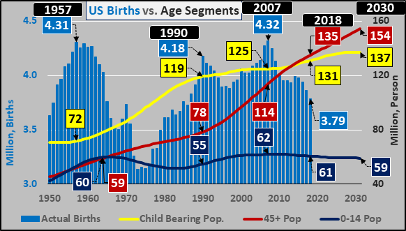 Ci-dessous, les naissances (colonnes bleues) par rapport aux segments de population. La ligne bleu foncé représentant la population des gens âges 0 à 14 ans par rapport à la population des gens âges de plus de 45 ans (ligne rouge) est très révélatrice. Depuis 1962, la population âgée de 0 à 14 ans est demeurée essentiellement inchangée, tandis que la population âgée de plus de 45 ans a plus que doublé... et a augmenté de +76 millions. Pendant ce temps, les augmentations mineures de la population des gens âgés de 15 à 45 ans en âge de procréer (ligne jaune) continuent d'être annulées par la baisse des taux de fécondité. Ainsi, une population en âge de procréer qui est près du double de ce qu'elle était en 1957 a 12 % de moins de naissances au total... et les naissances continuent de chuter rapidement.