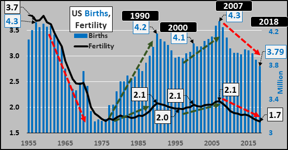 De 2008 à 2018, il y a eu 4,4 millions de naissances de moins aux États-Unis que ce que le recensement américain prévoyait dans ses projections pour 2008. En 2018, le nombre de naissances aux États-Unis était inférieur de plus de 500 000 à celui de 2007. Le déclin marqué et continu de 12 % des naissances depuis 2007 est tout à fait contraire aux fortes hausses des prix des actifs et de l'activité économique... et aux attentes du Bureau du recensement et de la Réserve fédérale. Le graphique ci-dessus détaille les naissances annuelles (colonnes bleues) et le taux de fécondité (ligne noire). Au cours de chaque précédente reprise économique et bulle financière, les gains ont été suffisamment généralisés pour favoriser un taux de fécondité plus élevé et une plus grande quantité de naissances... jusqu'à ce que, dans le cycle actuel, le résultat inverse soit observé depuis plus d'une décennie. Quelles que soient les politiques en place, elles ne se traduisent pas par le bien-être économique et financier de la population en âge de procréer... et la fécondité et les naissances le reflètent.