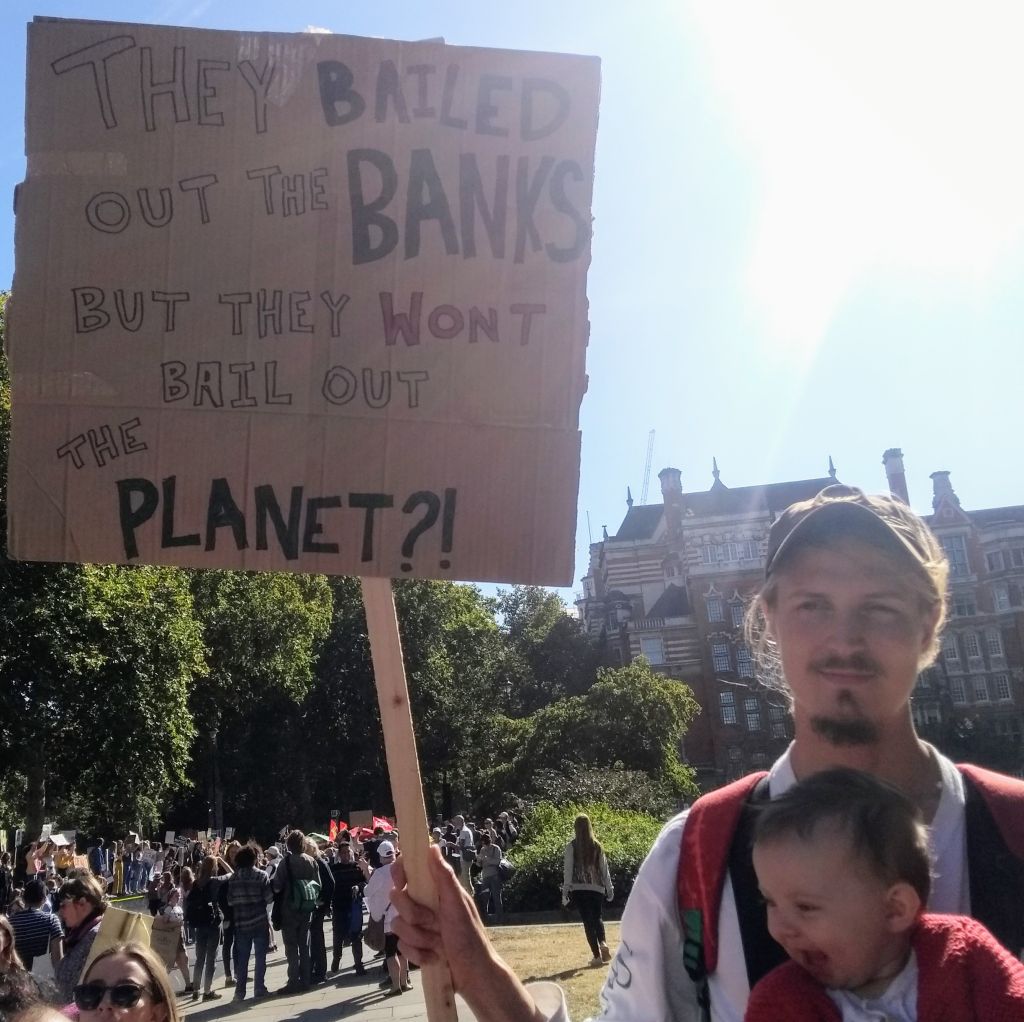Josh (London, UK)Josh a dit: «Je suis ici parce que je reconnais la catastrophe qui se profile à l'horizon, et parce que quand on a un jeune bébé, le problème devient d'autant plus déchirant et urgent. L'argent existe pour lutter contre les changements climatiques. Ils ont imprimé des billions pour soutenir les banques. Mais il y a des intérêts en jeu qui gardent les ressources du monde investies pour le profit et non pour les besoins vitaux.»