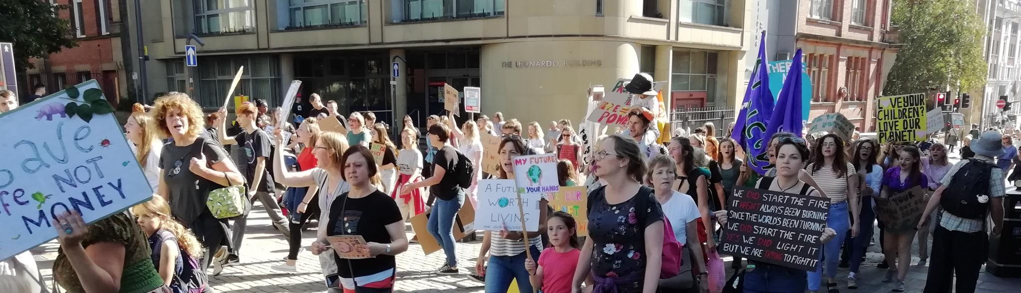 À Manchester, Bobby, un élève de 14 ans de l'école secondaire Chapel-en-le-Frith High School dans le Derbyshire voisin, est venu protester avec ses camarades de classe. «Je veux faire ma part avant qu'il ne soit trop tard, a-t-il dit. Personne d'autre ne fera quoi que ce soit. Les compagnies pétrolières et de combustibles fossiles sont égoïstes, c'est une question d'argent!»