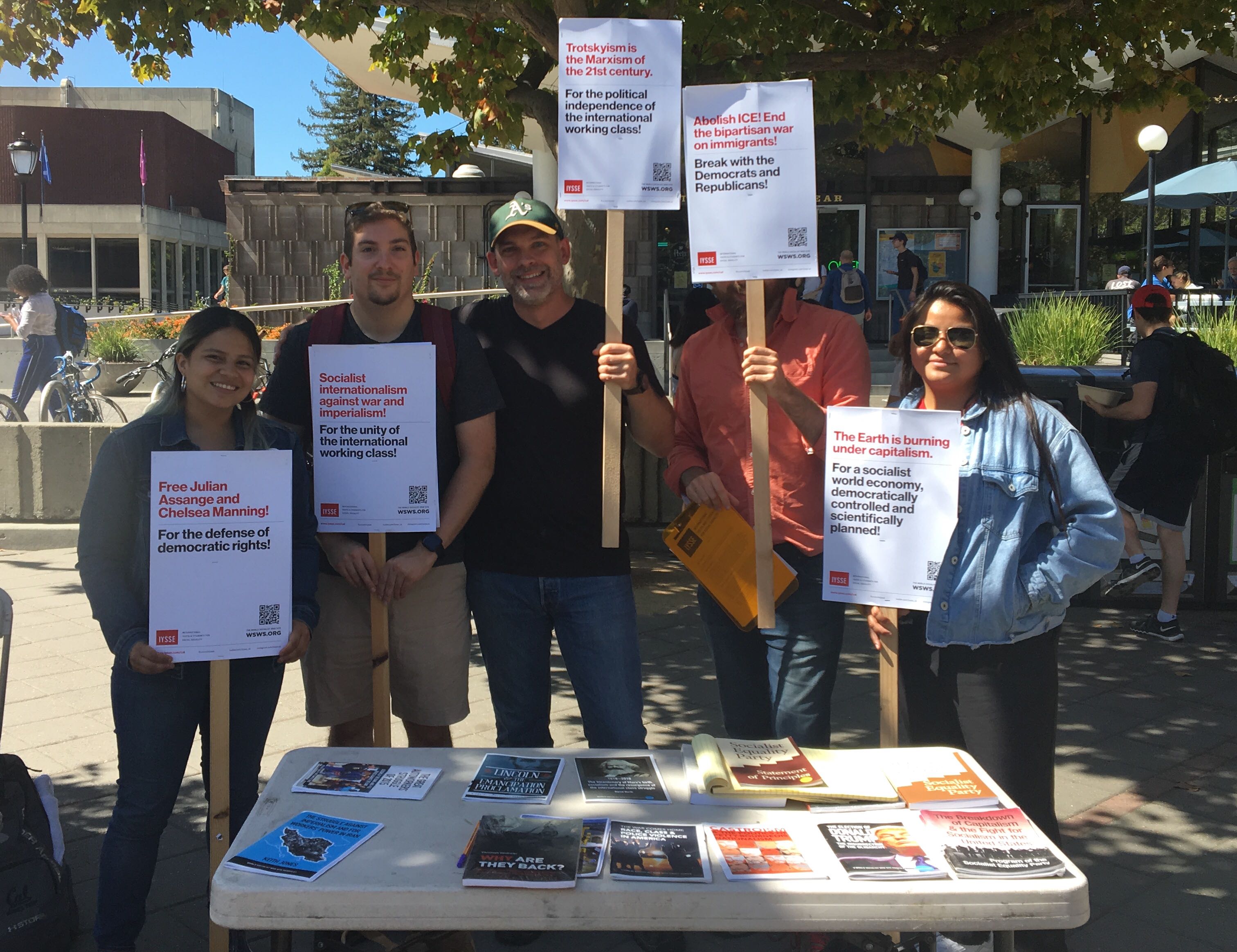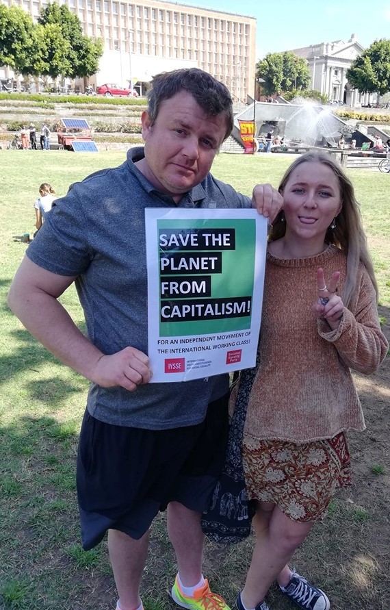Students holding placards distributed by Berkeley IYSSE.Un autre manifestant à Los Angeles, Jose, a déclaré: «Beaucoup de problèmes affectant le climat ne sont pas dus à des choix individuels. Les petites actions que nous prenons nous aident, mais ce ne sera pas suffisant tant que nous n'aurons pas changé le système. Le capitalisme n'est pas un système durable. La planète ne peut pas le supporter. Les jeunes commencent à comprendre qu'il ne s'agit pas seulement de choix personnels, mais aussi de parler à leur famille et aux gens qui les entourent. J'ai fait un effort pour parler à d'autres personnes intéressées par la gauche.