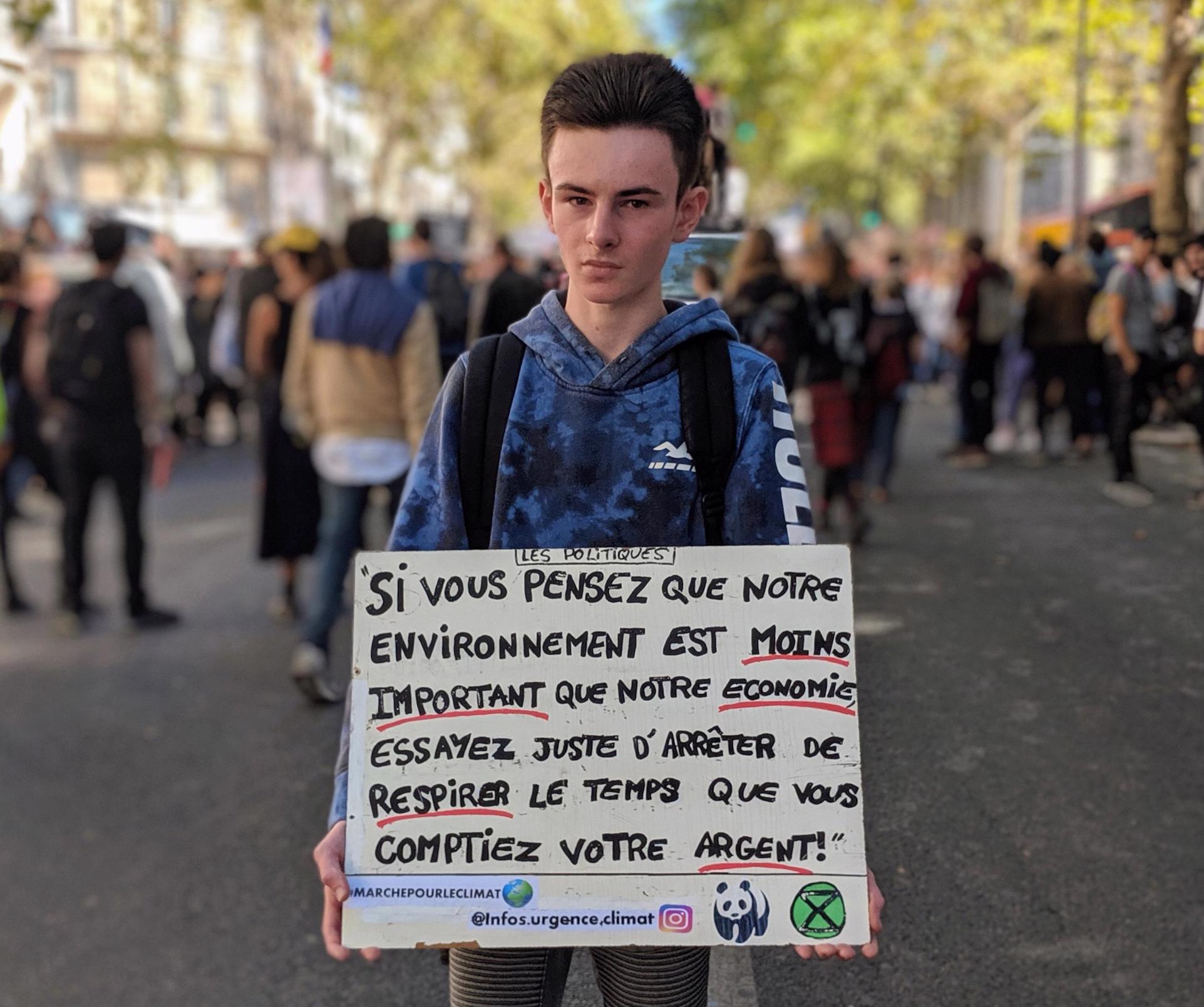 Jean-Baptiste (Paris, France)Jean-Baptiste est un lycéen de 15 ans de la banlieue parisienne. Son panneau dit: «Si vous pensez que notre environnement est moins important que notre économie, essayez juste d'arrêter de respirer le temps que vous comptiez votre argent!»
