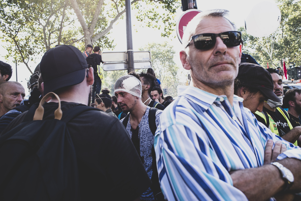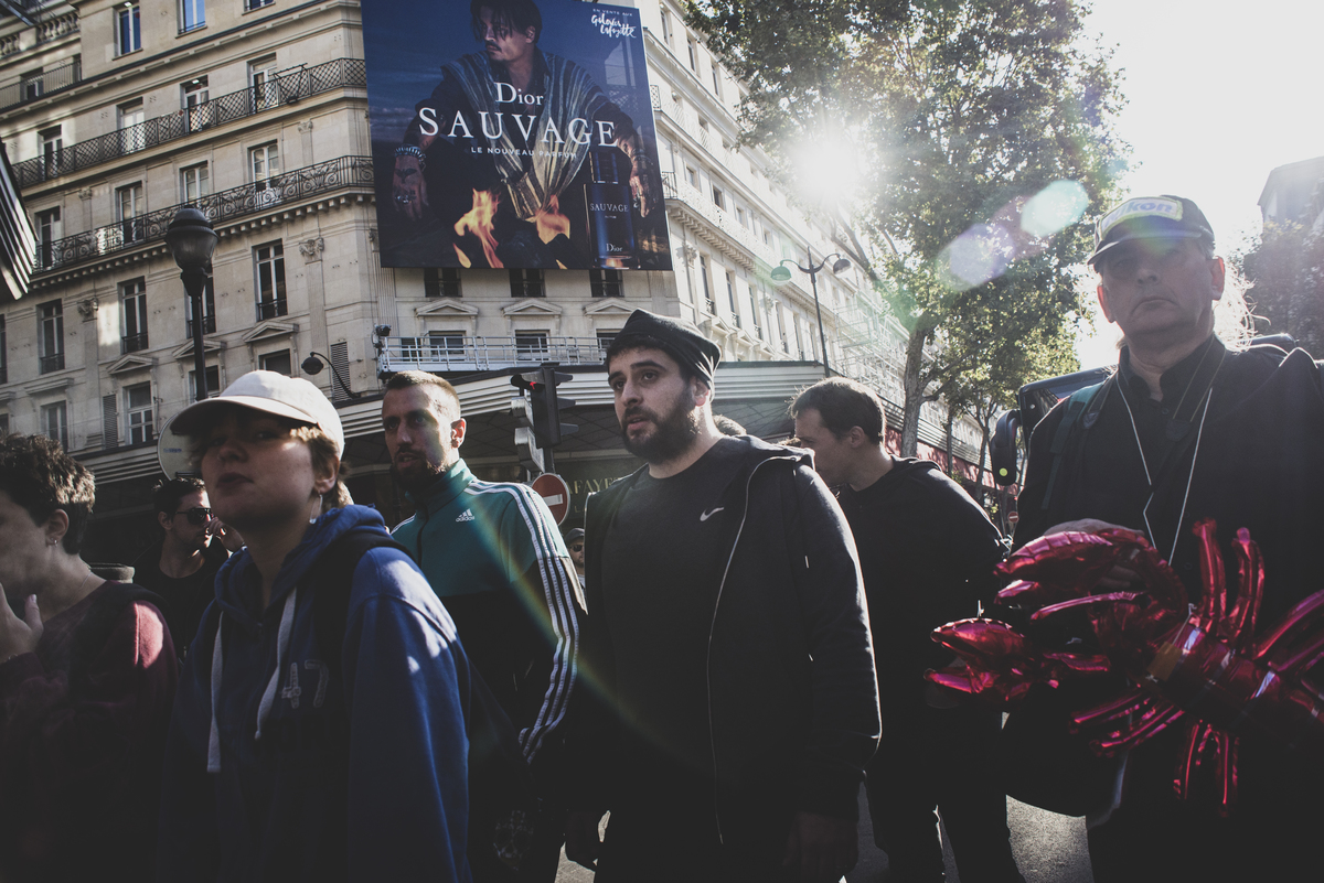 Après le départ des manifestants plus de 15.000 selon l'agence indépendante Occurrence, 50.000 selon les organisateurs, un cortège de tête se forme rapidement, composé de Gilets jaunes et d'autonomes. Juste derrière, les têtes d'ONG brandissent une banderole et un portrait d'Emmanuel Macron baladé à l'envers et entraînent les manifestants climat. On marche ensemble en se jaugeant un peu : aux « Siamo tutti antifascisti ! » (Nous sommes tous antifascistes) et aux « On est là, on est là, même si Macron ne veut pas, nous on est là, pour l'honneur des travailleurs et pour un monde meilleur » des premiers répondent les « On est plus chauds, plus chauds, plus chauds que le climat » des seconds. Dans le mouvement climat, l'agacement pointe quand le cortège de tête se met à scander « Tout le monde déteste la police » et « La non violence protège l'État ». « Ici, les différentes personnes ne sont pas d'accord sur les règles du jeu, résume un Gilet jaune venu de la Somme. Et certaines sont OK pour suivre les règles du jeu imposées par le gouvernement. »