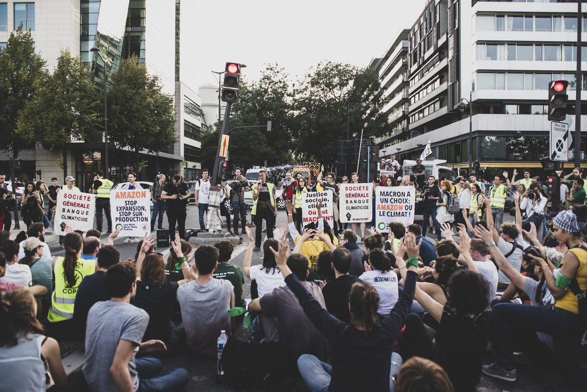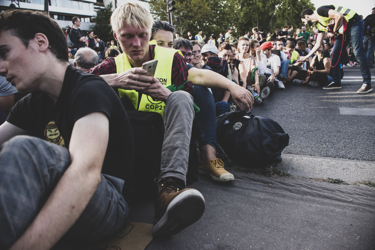Finalement, le cortège arrive à destination, parc de Bercy. Un peu avant 18 h, des activistes des différentes organisations climatiques s'asseyent en ligne pour bloquer le pont de Tolbiac et déroulent trois banderoles « Macron, polluter of the Earth », « Pollueurs, irresponsables, il est temps de payer », « Climat, social, mêmes responsables, même combat » face à une douzaine de camions de CRS et une double rangée de forces de l'ordre positionnées rue Neuve-Tolbiac.