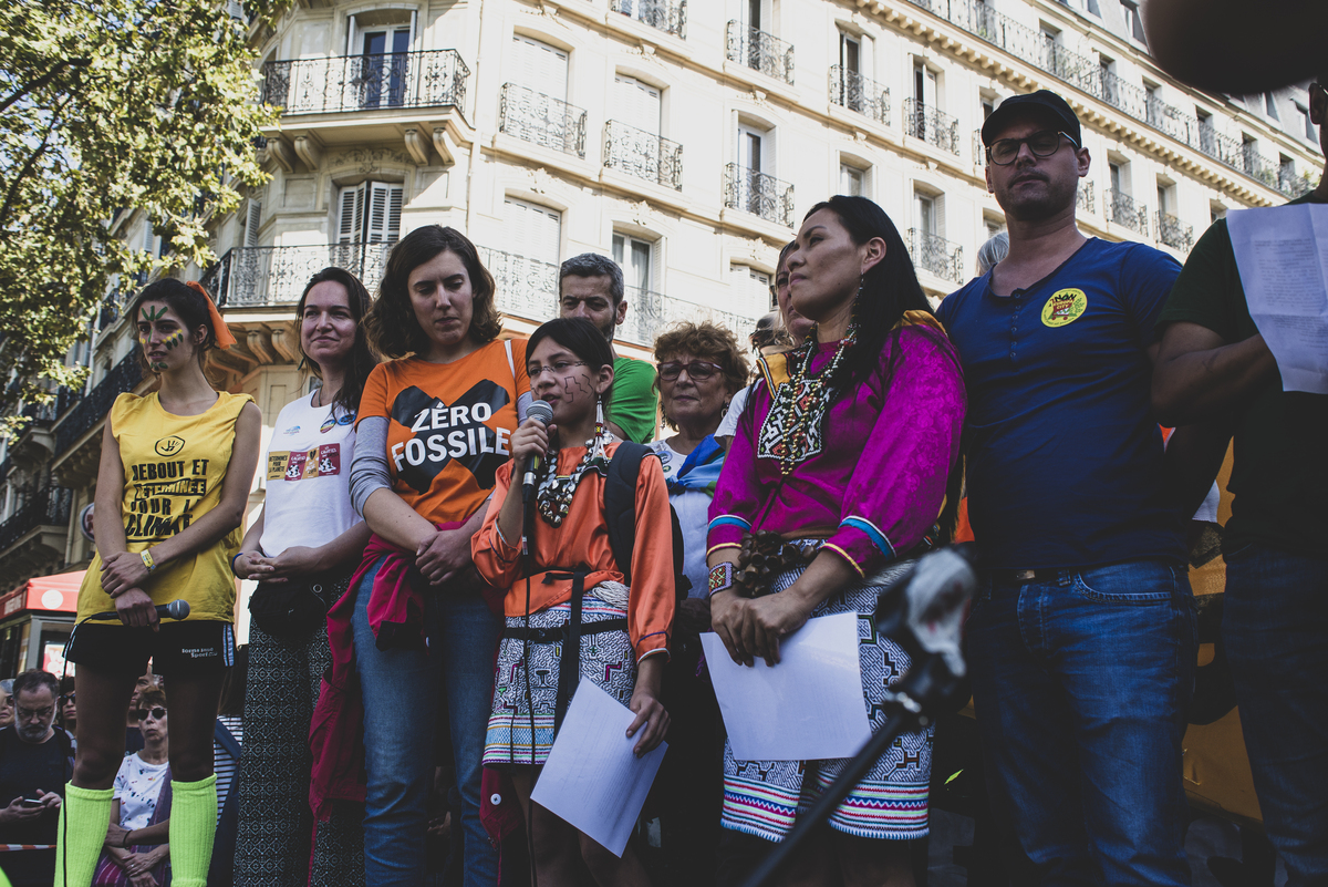 Côté mouvement climat, une scène a été installée, où se succèdent les prises de parole. « On est las de l'addiction aux énergies fossiles, on est fatigué d'entendre Emmanuel Macron nous dire qu'il ne signera pas d'accord commercial international qui soit néfaste pour le climat avant que, fin juillet, le Parlement adopte le Ceta, dit Jean-François Julliard, directeur général de Greenpeace France. À la veille du sommet des Nations unies, on ne veut plus de ces doubles discours. Il est important qu'aujourd'hui ne soit pas une énième manifestation mais le point de départ d'une nouvelle phase de mobilisation, plus résolue, plus déterminée, pour qu'on finisse par l'emporter. »