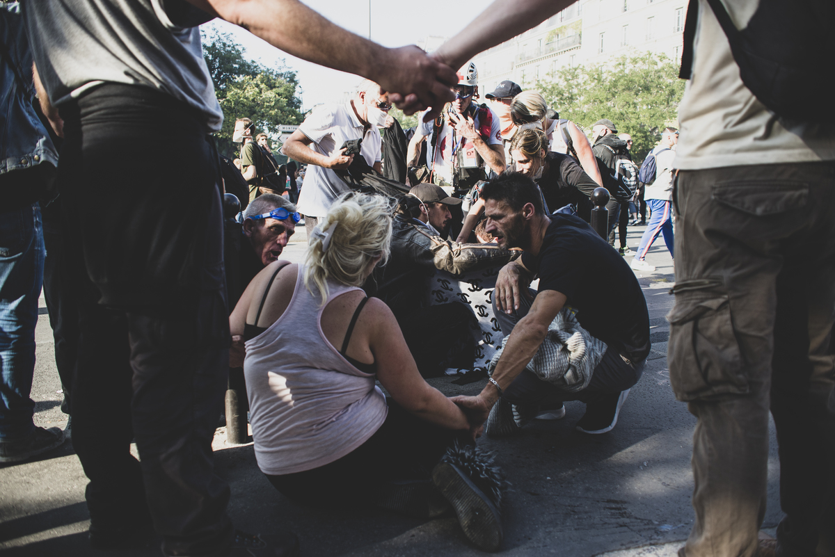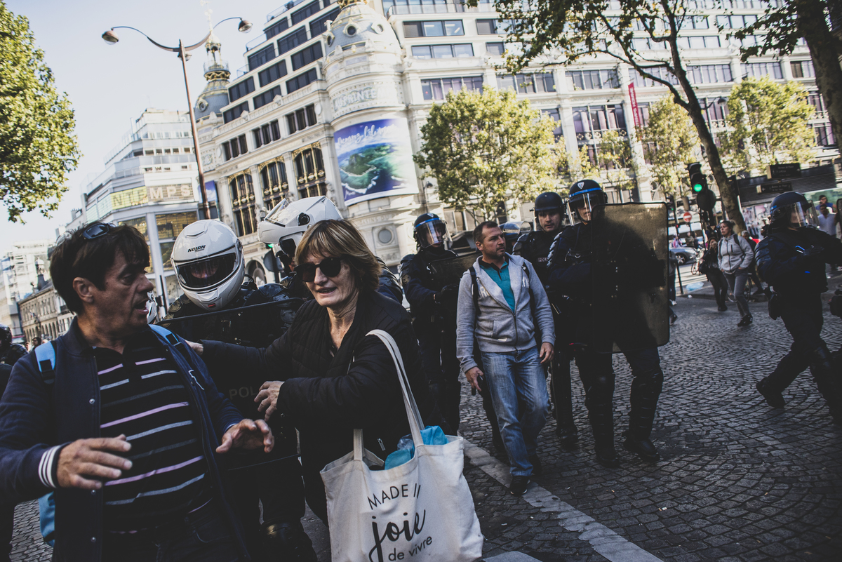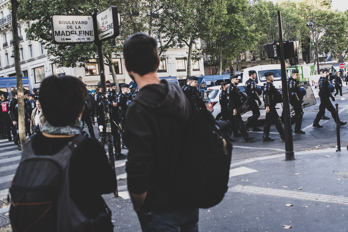 Très vite, les manifestants se sont fait refouler vers la rue Tronchet par une charge des forces de l'ordre. « Oui, c'est ça, mettez le bétail sur les trottoirs », les invective Galate, excédée par les sommations d'un CRS. La Parisienne a déjà marché tour à tour avec des Gilets jaunes et des militants climat. « Les marches climat font bonne figure alors que les manifestations de Gilets jaunes font peur aux autorités de par leur caractère informe, débordant, observe-t-elle. Mais c'est la même génération no future : leur horizon est socialement et écologiquement bouché. »