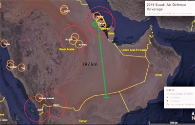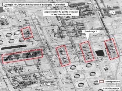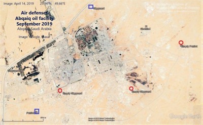 Les États-uniens ont commencé à analyser méthodiquement l'attaque de drones yéménites contre ces installations pétrolières, d'autant plus que leurs systèmes anti-aériens les plus performants étaient impliqués. Le rapport est secret mais l'Institut d'études internationales Middleburry de Monterey a publié plusieurs photos satellites déclassifiées du système de défense de la raffinerie d'Abqaiq, avant l'attaque. En ce qui concerne la raffinerie d'Abqaiq qui a été touchée par des drones yéménites, le dispositif de défense directe a été installé par les États-Unis (photo ci-dessus). Dans un rayon de 10 km autour de la raffinerie, ont été placées 2 batteries de grande portée Patriot PAC-2/3, une batterie de missiles à courte portée Shahine-Crotale et 3 sections d'artillerie avec radar de type Oerlikon et caméras Skyguard.
