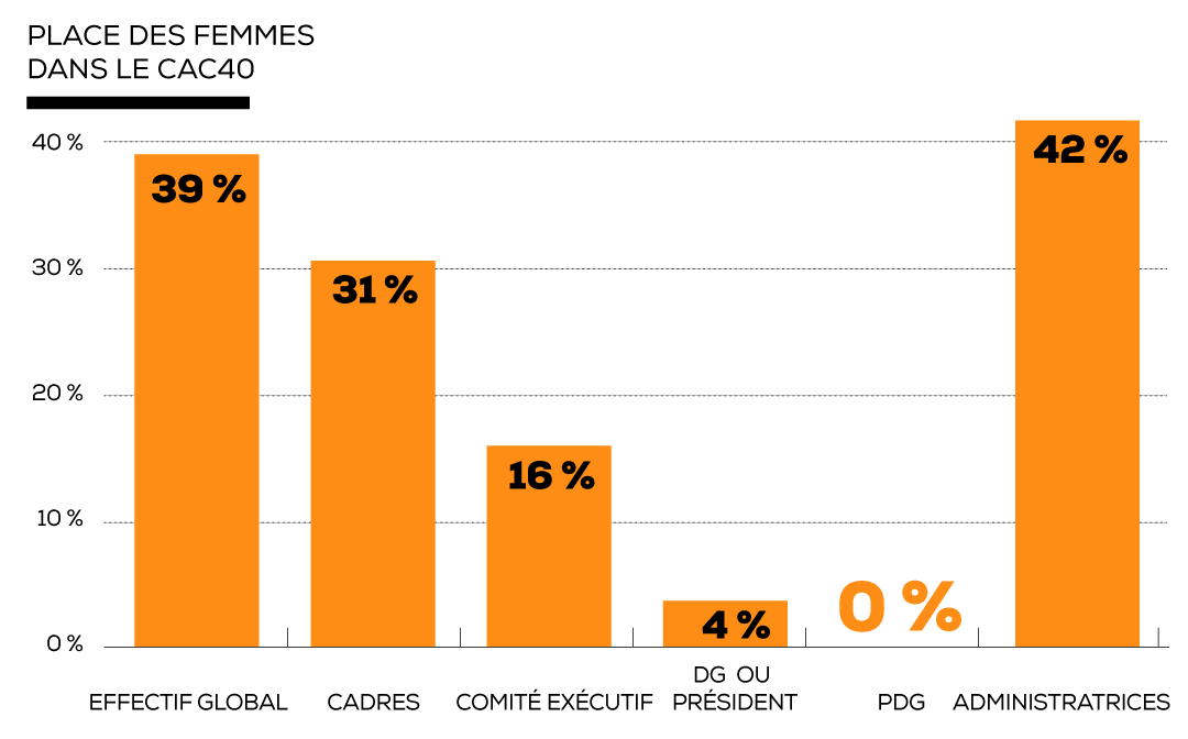 Dans le domaine de l'égalité hommes-femmes, les chiffres parlent d'eux-mêmes. Les femmes représentaient en moyenne, en 2018, 39% de l'effectif total du CAC40, mais 30% des cadres, et seulement 16% des comités exécutifs ou de direction. Pour ce qui est des conseils d'administration, pour lesquels la loi fixe un quota minimum de femmes, la proportion remonte à 41,8% (40,6% en 2017).