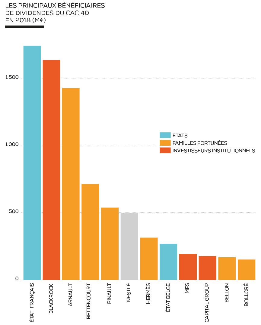 À qui profite concrètement cette générosité ? En première place avec 1,76 milliard de dividendes touchés au titre de l'année 2018, on trouve le budget de l'État français, à travers ses participations directes ou celles de Bpifrance et de la Caisse des dépôts. Engie (711 millions d'euros versés à l'État sous forme de dividendes) et Orange (426 millions) représentent les deux tiers de cette somme.