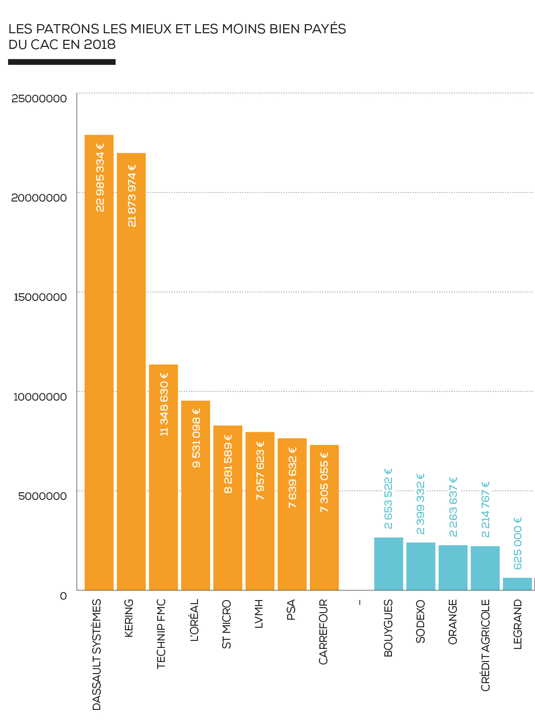 Pour Bernard Charlès, ce niveau de rémunération est habituel puisqu'il a déjà touché 15 millions d'euros en 2017 (son entreprise Dassault Systèmes n'était pas encore dans le CAC). En ce qui concerne l'héritier de la fortune Pinault, dont le père avait reproché en juin 2018 à Emmanuel Macron de « ne pas comprendre les petites gens », cette rémunération record tient au versement d'une prime exceptionnelle. Derrière ces deux patrons grassement payés, on trouve à nouveau celui de TechnipFMC (11,3 millions d'euros en 2018), puis celui de L'Oréal Jean-Paul Agon (9,5 millions).