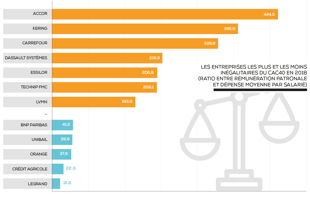 Les groupes les plus inégalitaires selon ces données sont Accor et Kering : un employé du groupe hôtelier au salaire moyen devra travailler 445 jours, soit un an et quasiment trois mois, pour gagner ce que touche son PDG en une journée ! Ce ratio est de 366 ! Le premier cas est dû à la faiblesse des dépenses moyennes par salarié dans le groupe, qui comprend nombre de métiers mal rémunérés et précaires. Dans le deuxième cas, cela reflète les inégalités créées par l'explosion de la rémunération de François-Henri Pinault. Enfin, Carrefour figure également sur le podium de ces entreprises particulièrement inégalitaires. Les moins inégalitaires, à l'inverse, seraient Legrand - un jour de travail du PDG équivaut à 15,8 jours de boulot d'un salarié -, Crédit agricole (22,5), Orange (37,6) et le groupe immobilier Unibail (39,9).