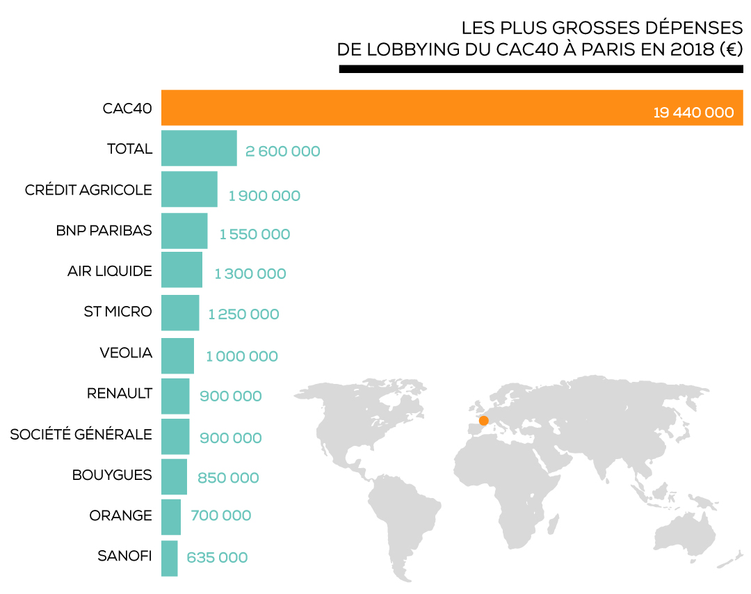 L'entreprise du CAC40 qui déclare le plus de dépenses de lobbying est le groupe pétrolier Total, avec 2,6 millions d'euros de dépenses déclarées. Cette position reflète le rôle important de l'État français dans la régulation et le soutien au secteur énergétique, et la diversité des activités dans lesquels le groupe pétrolier est engagé en France (gaz, raffinage et pétrochimie, solaire, et désormais fourniture d'énergie et agrocarburants). On remarque aussi le poids du lobbying du secteur bancaire (BNP Paribas, Crédit agricole et Société générale), lui aussi très dépendant des régulations mises en place au niveau national, et exposé aux conséquences du Brexit.
