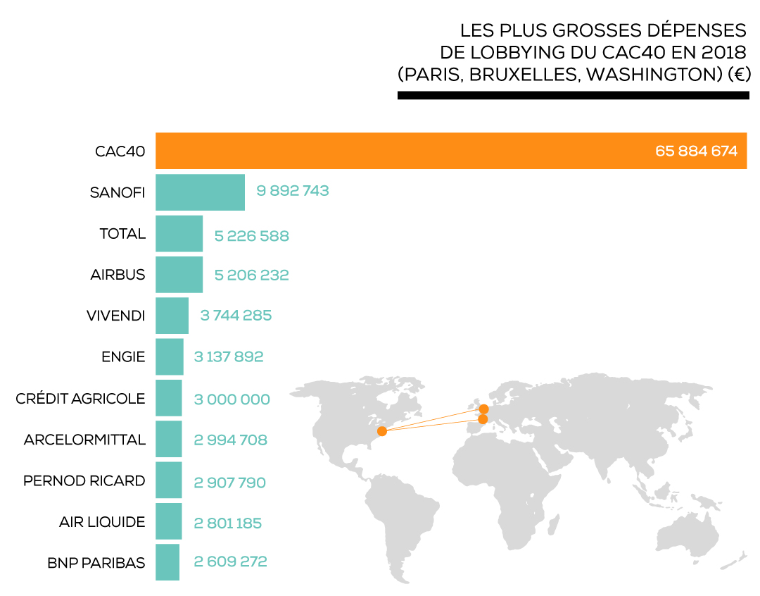 Dans les trois principales capitales où elles doivent théoriquement publier des chiffres sur leurs dépenses de lobbying, les entreprises du CAC40 ont dépensé collectivement 66 millions d'euros en 2018. Les plus gros lobbyistes du CAC40 sont Sanofi (et de loin, avec près de 10 millions d'euros de dépenses à elle seule), Total (5,2 millions d'euros dans les trois capitales) et Airbus (5 millions).