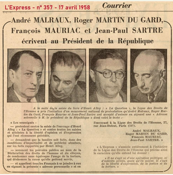 La saisie de La Question, en mars 1958, avait provoqué une vive campagne de protestations. Une adresse solennelle avait été envoyée au président de la République, René Coty, pour demander que "la lumière soit faite dans des conditions d'impartialité et de publicité absolue sur les faits rapportés par Henri Alleg" et aussi que " les pouvoirs publics au nom de la Déclaration des Droits de l'Homme et du Citoyen condamnent sans équivoque l'usage de la torture"...Cette déclaration portait les signatures de François Mauriac, Roger Martin du Gard, Jean-Paul Sartre. Au rang des signataires figurait aussi André Malraux. Si j'insiste, c'est que j'ai lu avec beaucoup de surprise, dans le journal Libération, la déclaration d'une historienne soutenant que Malraux était demeuré silencieux au moment de la saisie des exemplaires de La Question.