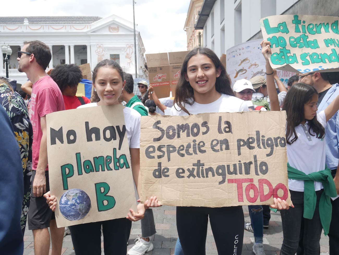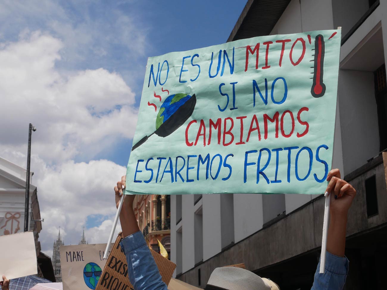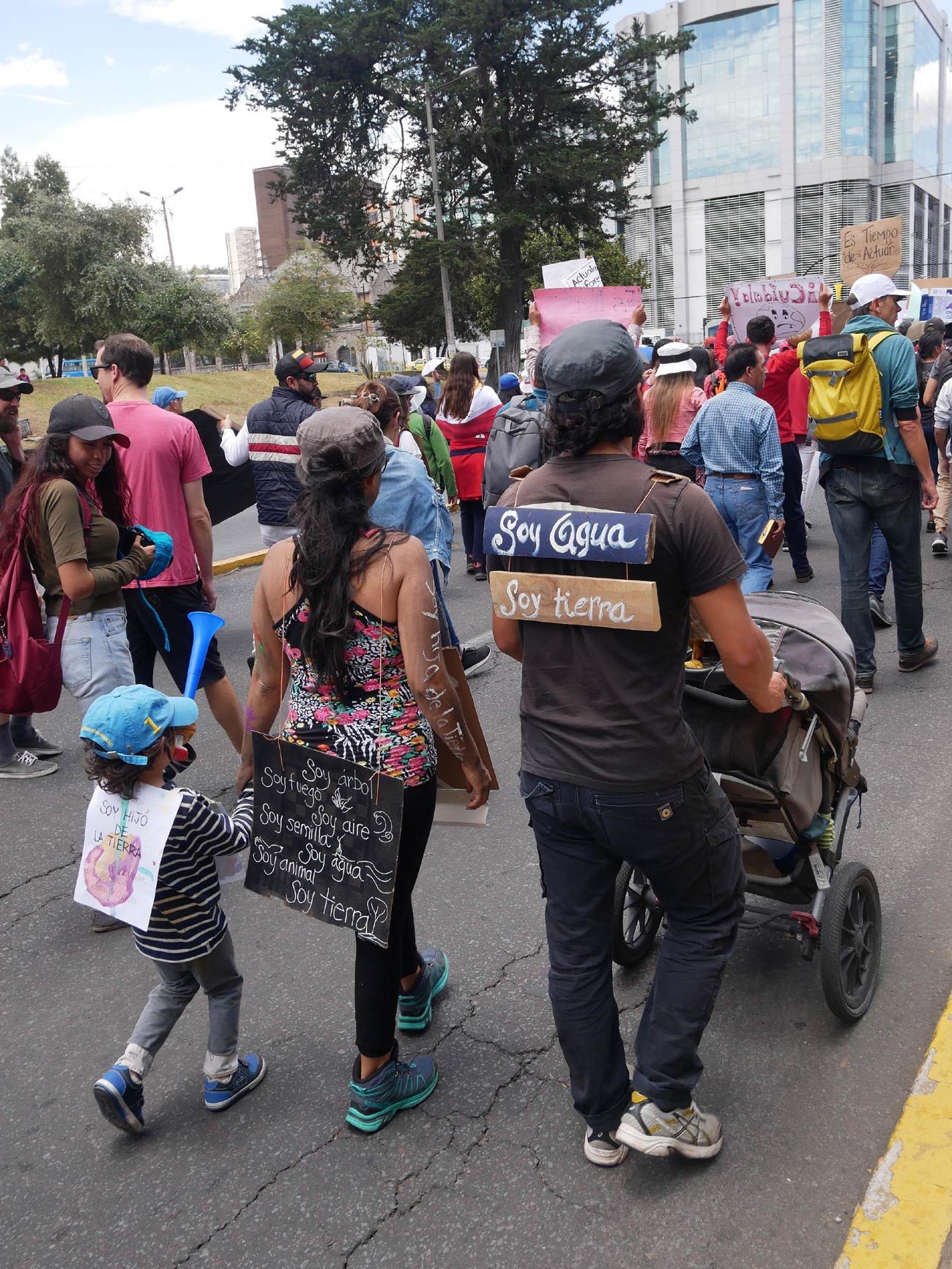 Organisée par le mouvement Extinction Rebellion Ecuador (ERE), né il y a à peine quatre mois et composé de 25 membres, la marche pour le climat de Quito s'est tenue le 27 septembre 2019. Le point de départ était donné à 11h, au parc El Ejido... et quel départ ! Pancartes toutes plus originales et percutantes les unes que les autres, musiques en tout genre, déguisements, et fanfares (nostalgie de ma chère Fanfouse de Sciences Po Toulouse quand tu nous tiens) ; tout était réuni pour assurer le succès de la marche. Tout comme les marches toulousaines, les participants étaient de toutes origines et tous âges, et il y avait notamment beaucoup de familles venues marcher avec leur poussettes. Karina m'explique : « Je ne suis pas très activiste [c'est sa première marche] mais, en tant que mère, j'ai un sentiment d'angoisse et d'anxiété quant à la situation environnementale... il était important pour nous [elle et son mari] qu'ils participent à la marche pour en prendre conscience, mais aussi pour réaliser que nous ne sommes pas seuls. À la maison, il est vrai qu'ils sont en immersion totale : agroécologie, toilettes sèches, compost... ». La jeunesse est également vue par Sofia comme la base du changement, aujourd'hui « ce sont les jeunes qui impulsent le mouvement et qui représentent notre futur ; donc ils doivent avoir conscience de l'urgence climatique actuelle ».