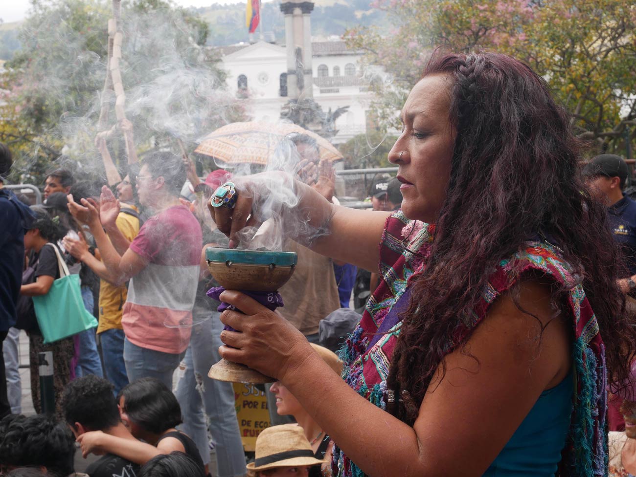 Cette marche se différencie également de celles auxquelles j'ai pu assister en France par ses participants. Certes, j'ai évoqué plus haut qu'ils étaient de toutes origines et de tous âges, mais je n'ai pas mentionné la présence de rituels particuliers réalisés par certains participants. Une singularité. Tel est le cas de nombreuses femmes qui passaient dans l'ensemble du cortège pour brûler et diffuser du bois Palo Santo, arbre sacré en Amérique latine et utilisé traditionnellement comme encens afin d'éloigner les mauvais esprits au cours de rites chamaniques. Des mauvais esprits ? « Les politiques, les industriels et les climato-sceptiques » m'a répondu l'une d'elles (cf photo ci-dessous). Parmi les participants, j'ai aussi pu voir une certaine identification aux peuples indigènes (il y a 13 nationalités indigènes en Équateur, dont 11 vivant en Amazonie.), comme pour défendre le retour aux origines et revendiquer leur culture ; à travers le maquillage, les habits et les danses.