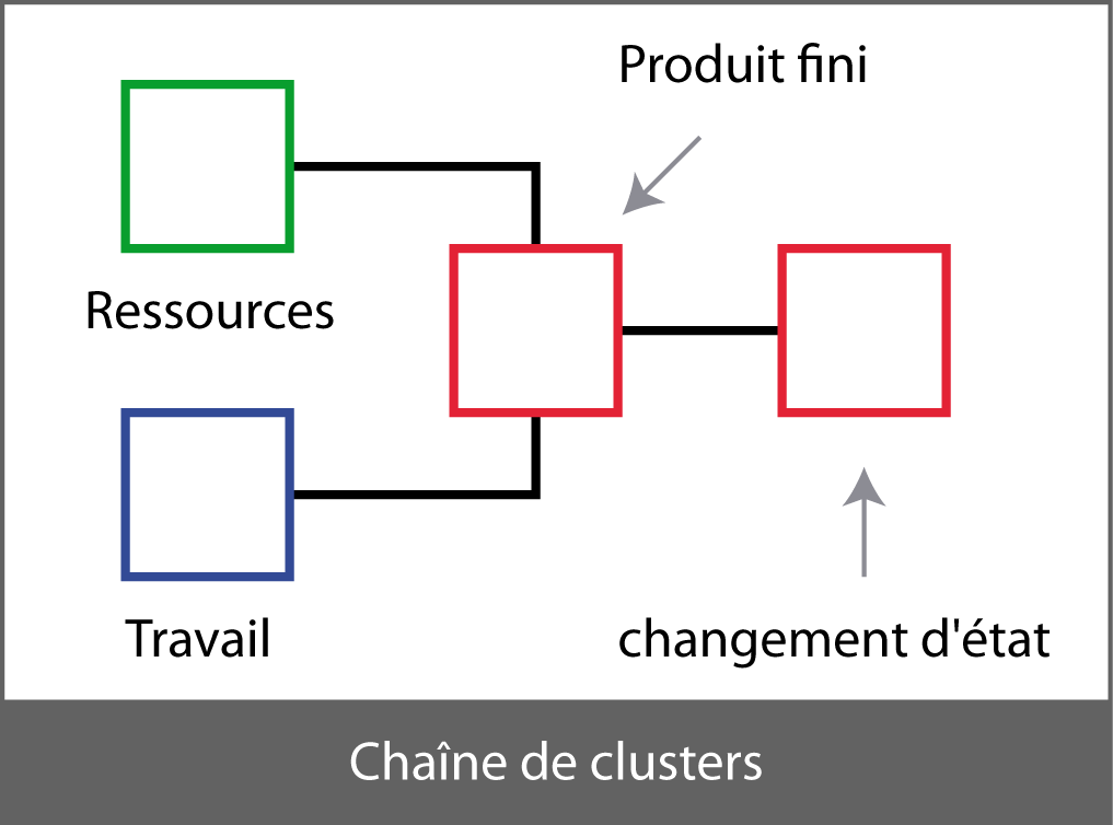 Les clusters sont créés par l'usage des ressources et le travail accompli, afin de compiler un produit fini. Quand il circule, il est dupliqué avec des changements de propriétés, par exemple lors de sa maintenance ou d'un changement de propriétaire.