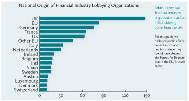 La dépense ? En 2014, on comptabilisait 120 millions d'euros annuels, recensés par Corporate Europe Observatory pour un effectif de 1'700 collaborateurs. Evidemment les JP Morgan, Goldman Sachs et autres Citigroup y sont dignement représentés. A relever la forte présence britannique qui s'élève à 140 lobbies sur les 700 recensés 5.
