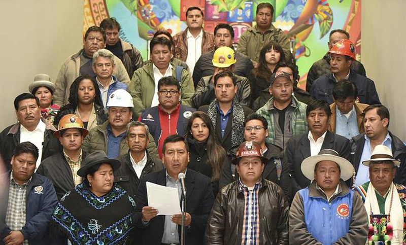 Les deux organisations ont publié une déclaration après avoir rencontré le président Evo Morales. « Nous nous sommes déclarés dans l'état d'urgence et la mobilisation nationale avec une première concentration nationale pacifique le mercredi 23 octobre à midi sur la place San Francisco », indique le document.