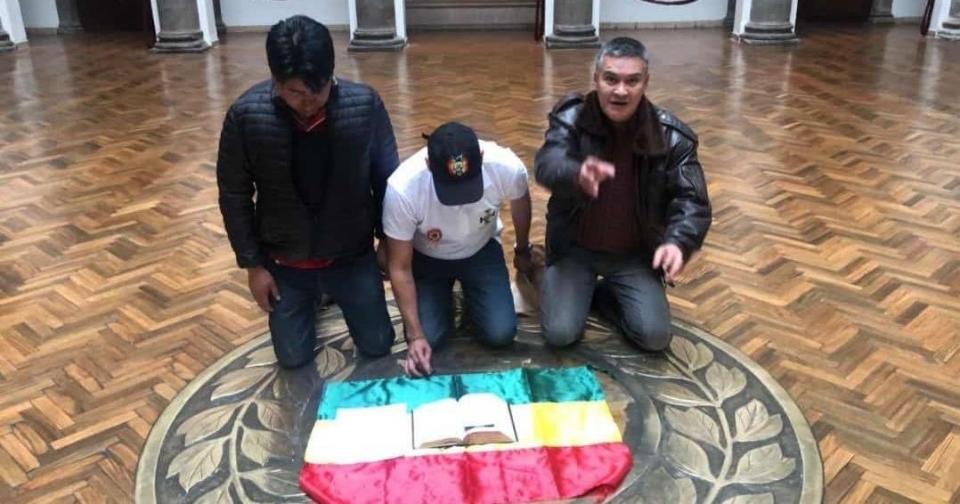 Camacho, dirigeant du Comité civique Pro Santa Cruz, Pumari, et l'avocat Eduardo León, se sont agenouillés sur un immense bouclier bolivien au milieu d'une salle de la maison du gouvernement, où ils ont déposé la lettre et la Bible, selon une photo publiée dans les réseaux sociaux.