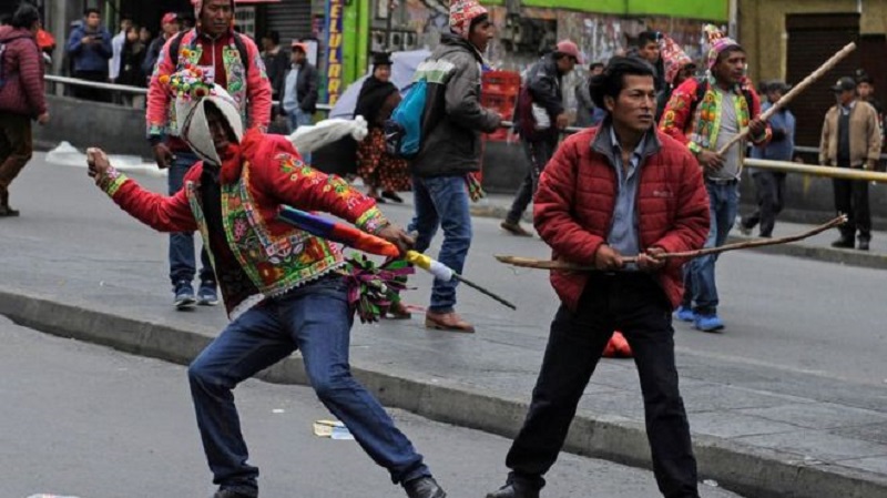 Des milliers de paysans commencent à se rendre dans la ville de La Paz encerclant la capitale pour rejeter le coup d'État. Au cours de la journée, la police a réprimé les manifestants avec des tirs à balles réelles. Les forces armées ont reçu l'ordre de sortir dans la rue, ce qui pourrait entraîner un bond dans l'escalade répressive qui a déjà tué trois personnes. Il faut absolument manifester son soutien parce que les forces fascistes qui ont pris le pouvoir en Bolivie les considèrent comme des sous hommes et ne craindront pas le bain de sang que Evo a souhaité éviter. (note de danielle Bleitrach