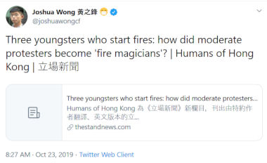 L'étudiant « emblêmatique » des US Joshua Wong a  qualifié les pyromanes parmi les émeutiers de « magiciens du feu ». Comme d'autres dirigeants de l'opposition « pro-démocratie », Wong a refusé de condamner les violences.