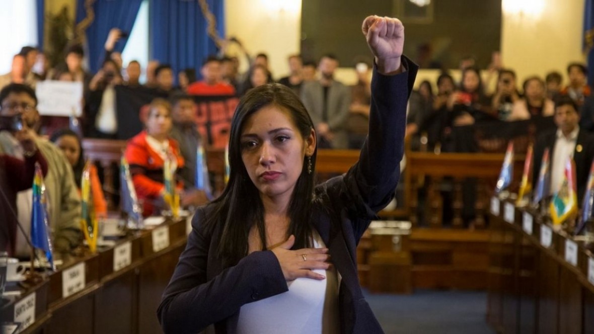 IL faut faire savoir partout que la COnstitution de Bolivie prévoit qu'en cas d'empêchement du président et du vice président, du président de l'assemblée nationale c'est au président du sénat de prendre la suite et d'organiser les élections. Le parti d'Evo Morales le mas détient ces deux dernières charges, tout a été fait pour empêcher les legislateurs et leur président du MAS de prendre place et en leur absence, c'est cette hystérique que vous avez vu se déclarer bible à la main présidente de la Bolivie, mais cette jeune femme a réussi à rentrer dans le sénat à sa place et poing levé elle revendique le respect de la Constitution. Ce fait doit être divulgué parce que les médias aux ordres font tout pour le cacher. Elle s'appelle Adriana Salvatierra, diffusez parout son message, soutenez cette jeune femme courageuse (note et traduction de Danielle Bleitrach)