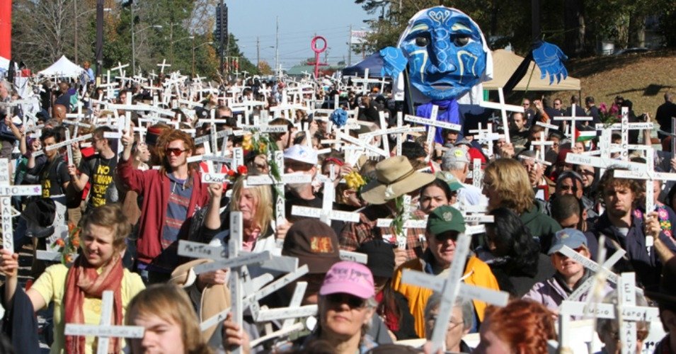 Pendant de nombreuses années, des manifestants anti-guerre ont organisé une vigile devant le siège de la SOA à la base militaire de Fort Benning, près de Columbus, en Géorgie.