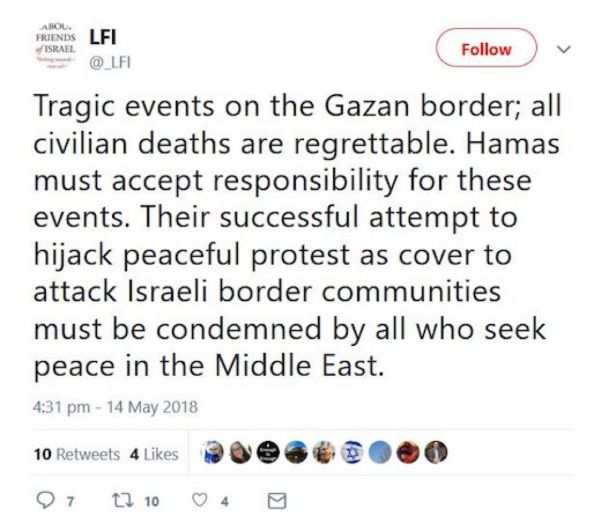 More than 220 Palestinians, including women, children, journalists, and medical staff, have been killed by Israeli snipers at the protests, while tens of thousands more have been maimed. But in a blatant example of anti-Arab racism, the LFI has blamed Hamas for these deaths, as though ordinary Palestinians in Gaza are simply pawns of Hamas and lack the volition to demand for themselves an end to an Israeli blockade that has imprisoned them for 12 years.