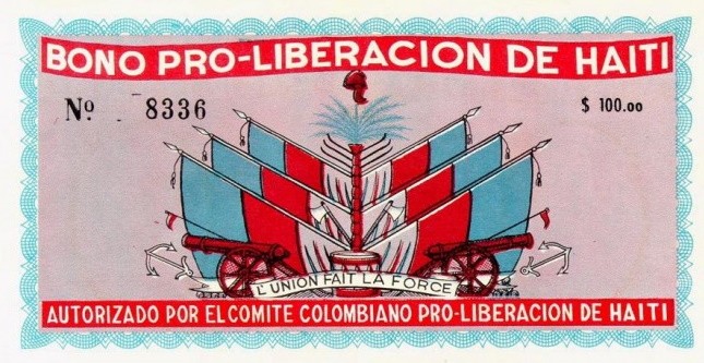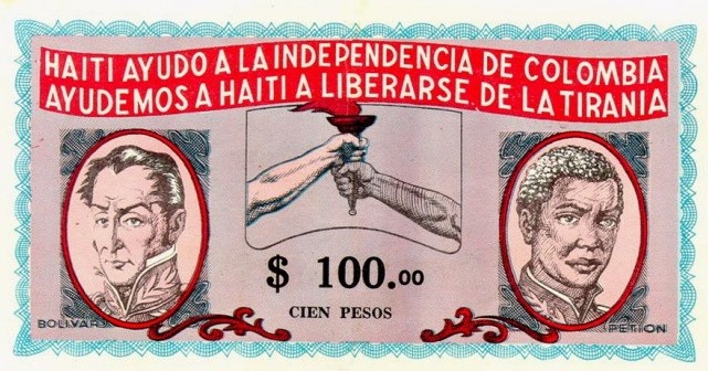 Bon colombien de soutien à la lutte d'Haïti pour sa libération, rappelant l'aide matérielle et militaire apportée par Alexandre Pétion au Libérateur Simon Bolivar