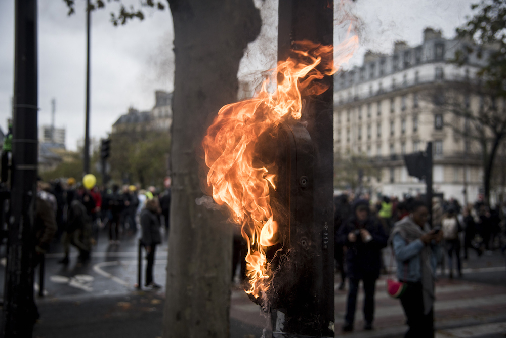 Quelques manifestants mettent le feu à du matériel de chantier. D'autres jettent dans le brasier des trottinettes électriques. Les pompiers interviennent pour éteindre les flammes, sous les encouragements. « Pompiers rejoignez-nous. Vous aussi les flics vous frappent », pouvait-on entendre. Mais à force d'être gazés et chargés depuis le début de la matinée, beaucoup commencent à perdre patience.