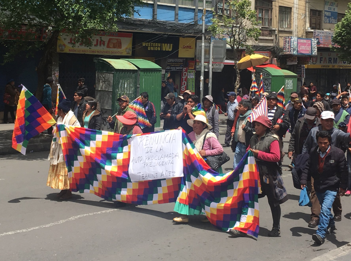 These attacks on the wiphala prompted outrage and compelled a wave of marches in La Paz, El Alto and Cochabamba in which protestors demanded 'La wiphala se respeta, carajo" (Respect the wiphala damnit), and called for the resignation of Añez. These protests are also in part, a reaction to the upsurge in racist and gendered violence which accompanied the elections last month. Smeared on the wall outside UMSA, the public university in La Paz, were the words "Indians out of UMSA". A MAS mayor, Patricia Arce Guzman, was attacked by opposition protesters who forcibly cut off her hair, dragged her through the street and covered her in red paint and dirt. The director of radio for the peasants union CSUTCB - an organization allied with Morales which represents rural, usually indigenous workers - was chained to a tree while anti-government protesters ransacked the union's headquarters.