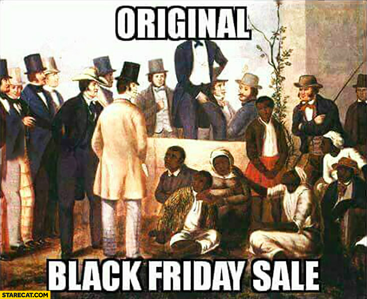 Mais le black friday est le témoignage que de l'esclavage et de la démocratie esclavagiste on est passé au capitalisme à savoir la marchandisation, la vente à bas prix des individus comme des marchandises, des peuples entiers puisque la conquête des territoires est devenue une nécessité de l'impérialisme, le petit peuple, la plèbe sont invités à participer à la fête en se disputant les produits, il leur est refusé le droit de coalition en tant que producteurs mais est exalté l'individualisation concurrentielle de la consommation.