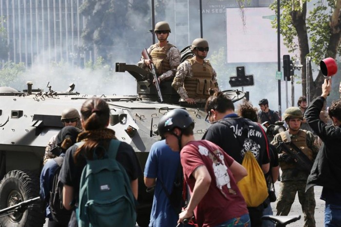 Le gouvernement, dans un geste désespéré, a imaginé de mobiliser les forces armées pour « protéger les infrastructures essentielles «. Sans abroger d'abord le décret-loi 1086, imposé par la dictature en 1983, qui fait de la police en uniforme un État dans l'État : une menace concrète pour la coexistence sociale et les droits des citoyens. Le juge Urrutia, au Congrès, a déclaré que de cette façon, l'État chilien « viole de façon permanente les droits humains ».