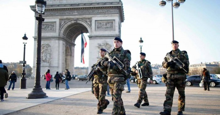 Soldats français du dispositif Sentinelle patrouillant à Paris