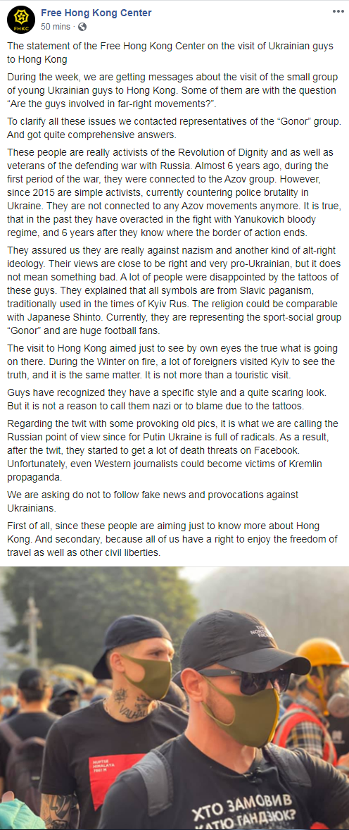Une page Facebook ukrainienne destinée à la défense de l'équipage Gonor et à leur voyage lundi après-midi semble combler l'écart entre les deux mouvements. Appelée elle-même le «Centre libre de Hong Kong», la page traite des liens supposés être forts entre les manifestations de Hong Kong et de l'Ukraine en 2014, avec les mots «parapluie» et «dignité» sur leur bannière, faisant référence aux manifestants de Hong Kong de 2014, considérées comme un précurseur des troubles actuels, et par les Ukrainiens d'extrême droite du coup d'État de 2014.