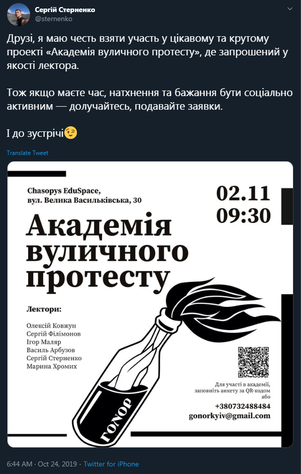 Au début du mois dernier, Filimonov, Sternenko et Maliar ont pris la parole devant une «académie de protestation de rue» à Kiev, dont les affiches présentaient un cocktail Molotov portant le logo «Gonor».