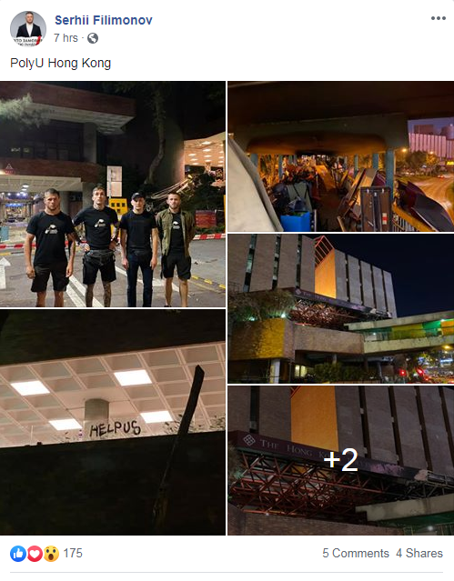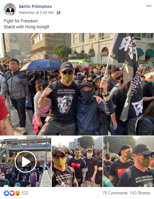 «Le combat pour la liberté aux côtés de Hong Kong !!», a déclaré Filimonov dans un autre billet, les montrant en train de poser, masqués, aux côtés des manifestants de Hong Kong.