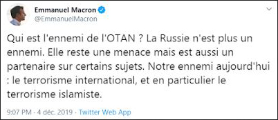 Russie qui, dixit Macron, n'est plus un ennemi, mais reste une menace. L'ennemi est le terrorisme islamiste.