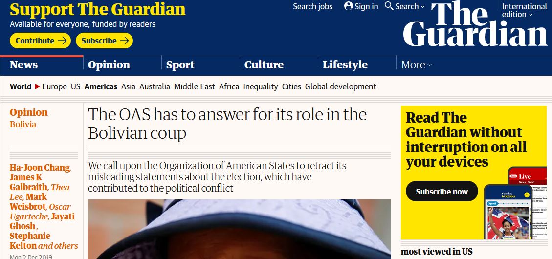 Cette publication d'universitaires, d'économistes et spécialistes des statistiques est très importante, publié dans le journal britannique The Guardian, elle dénonce le faux rapport de l'OEA et juge les élections dans lesquelles Morales l'avait emporté parfaitement légales. Ce sont les Etats-Unis qui sont interpelé mais l'UE qui a emboîté le pas au coup d'Etat doit également revoir sa copie et dénoncer ce qui a permis un coup d'Etat. L'OEA est totalement déconsidérée (note et traduction de Danielle Bleitrach pour histoire et société)