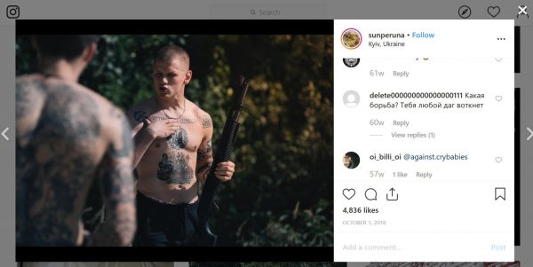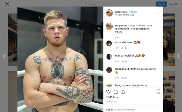 Très actif sur Instagram sous le nom de Sunperuna où il est suivi par une large audience, Filimonov a publié une photo arborant sur sa poitrine l'expression « Victoire ou Valahalla ».