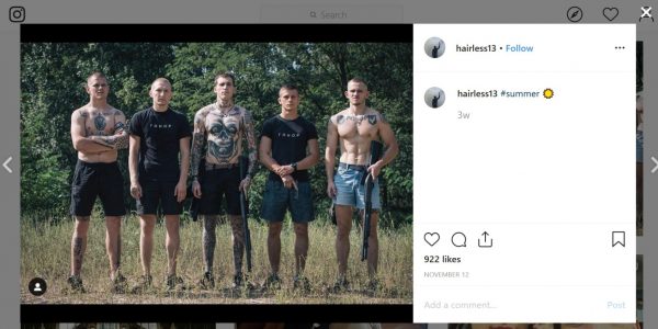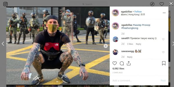 Un militant ukrainien d'extrême droite notoire qui s'appelle Maliar s'est joint à Filimonov lors de son voyage à Hong Kong. Sous le nom de xgadzillax, Maliar est populaire sur Instagram, où il compte plus de 23 000 abonnés. (Maliar a une cicatrice distinctive sur le côté gauche du cou, ce qui le rend facile à reconnaître sur les photos, voir ci-dessous.)