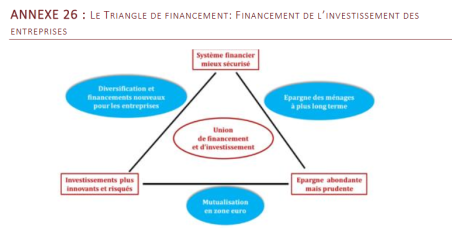 La conviction est qu'une Union de financement et d'investissement4 efficace en Europe est porteuse de solutions, si nous lui donnons bien trois ambitions : diversifier les possibilités de financement des entreprises ; mieux mutualiser l'épargne en zone euro ; orienter davantage les épargnants européens vers le long terme" 13.