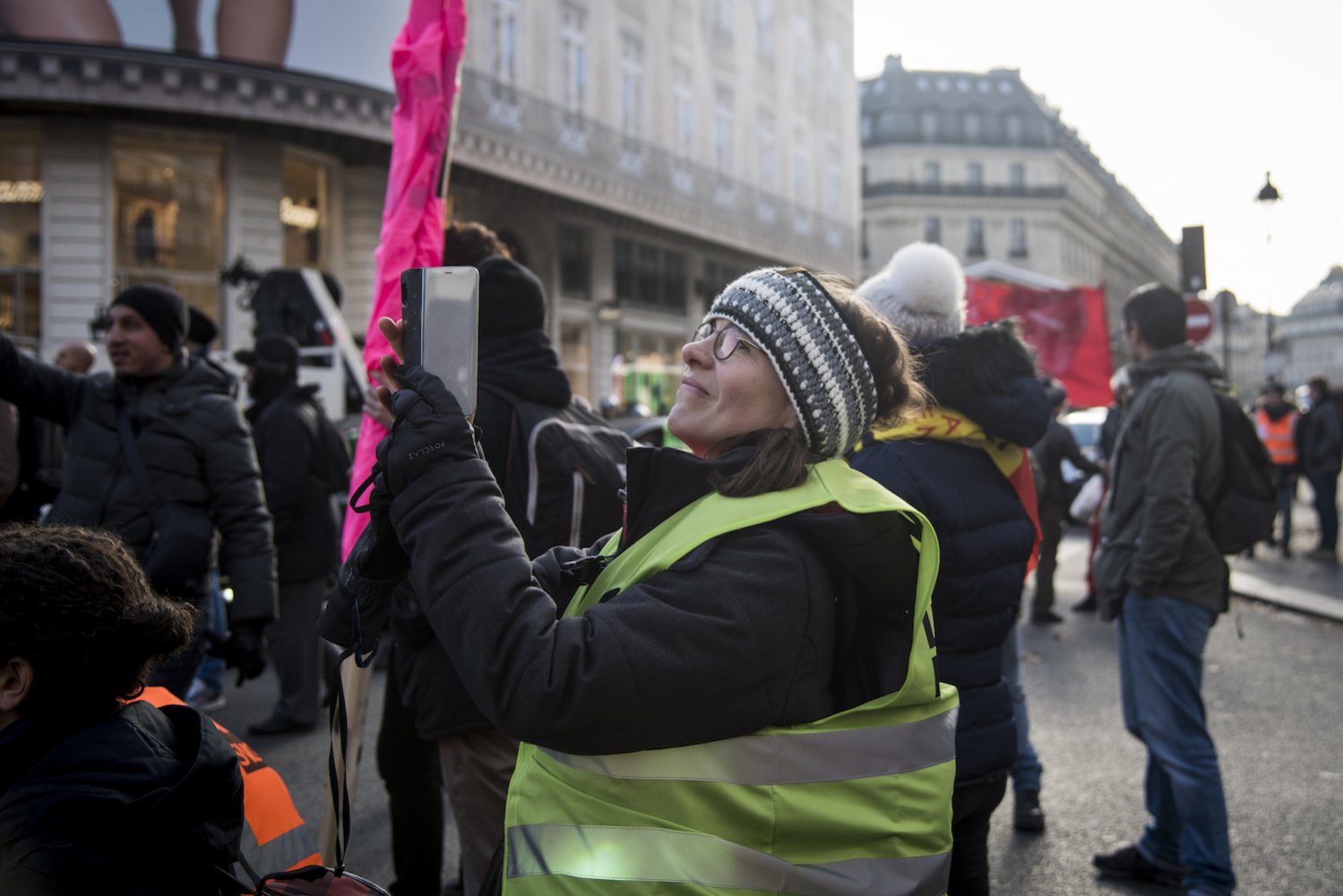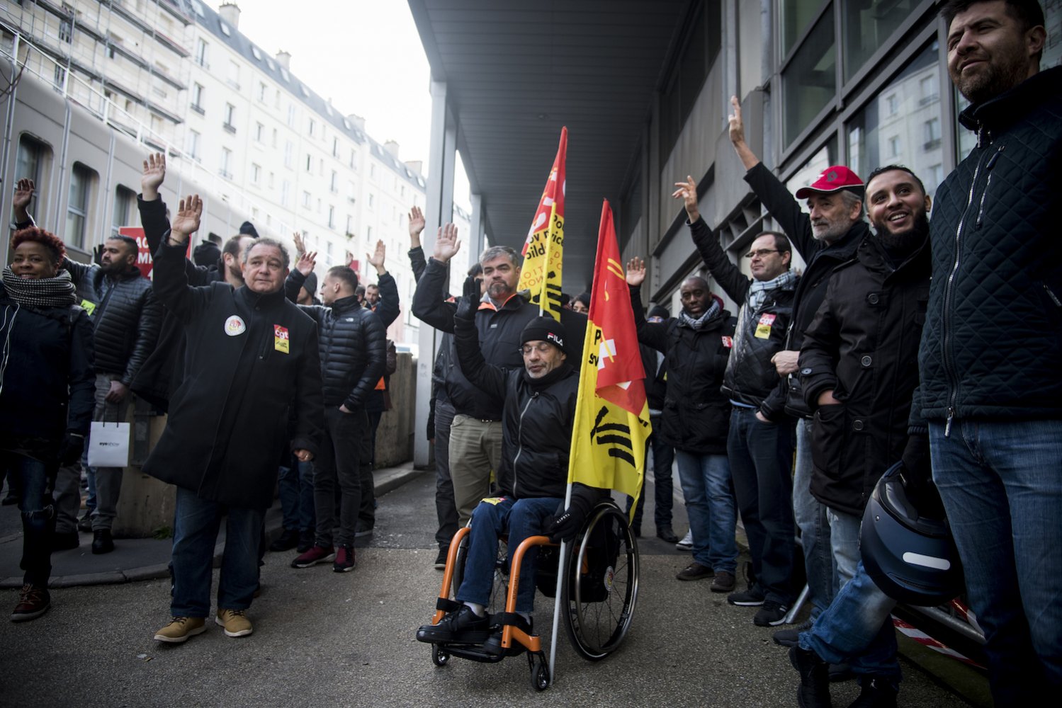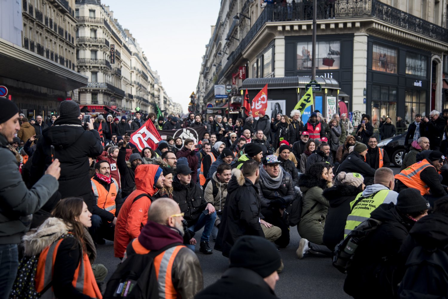 « Montparnasse ? C'est à une trotte de là », a soufflé un cheminot, conscient qu'il faudrait marcher quelques kilomètres afin de rallier le départ de la manifestation interprofessionnelle. Ni une, ni deux, les cheminots ont pris leur courage à deux jambes et se sont lancés dans une manifestation « sauvage » dans les rues de Paris, collant des autocollants syndicaux sur leurs passages. Rue Lafayette, ils ont marché à contresens du trafic, au milieu des voitures et des camions.